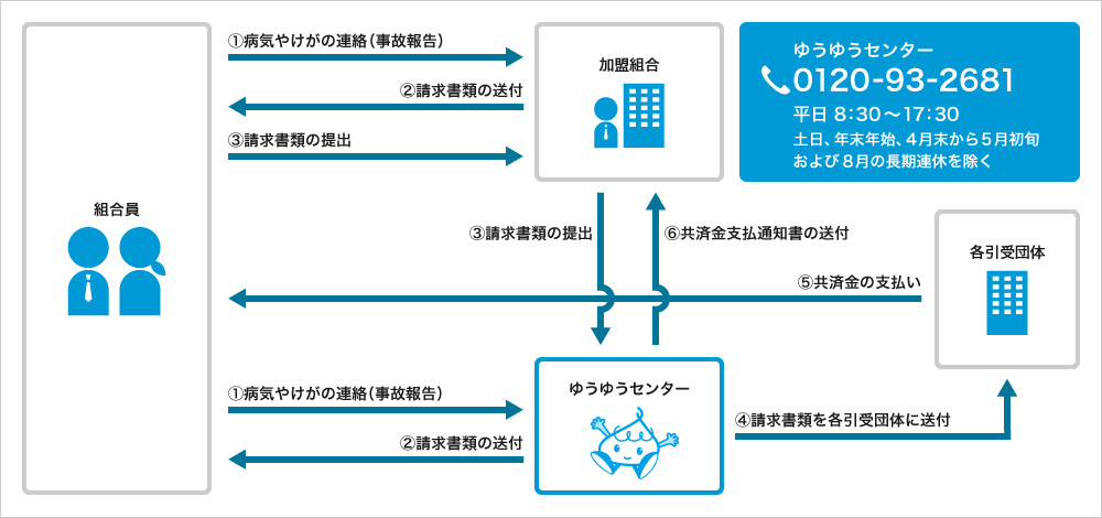 病気やけがにより共済金を請求する場合は、まず事故の報告を所属の労働組合まで行ってください。